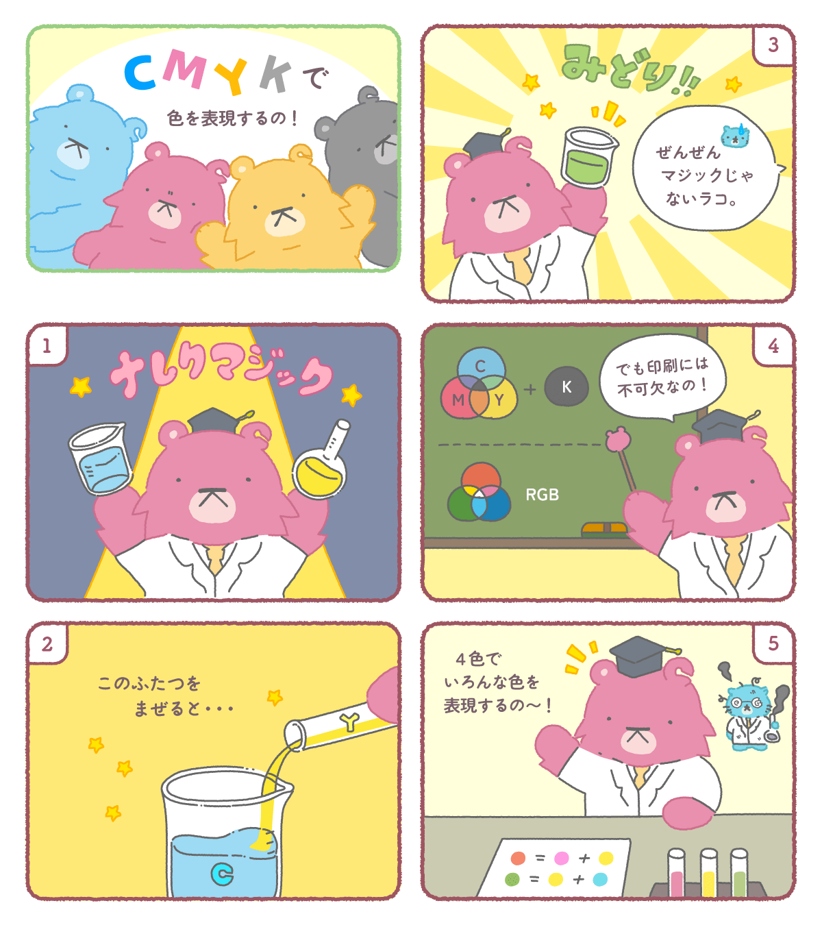 印刷の基本、「CMYK」を実験で確かめるナレクマちゃんのお話。
