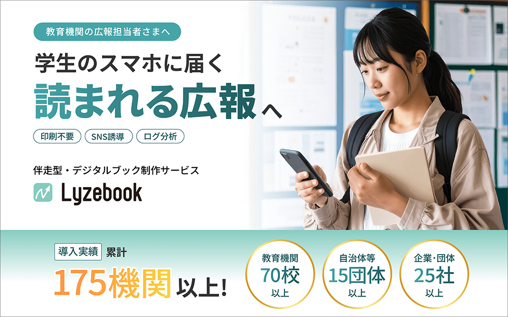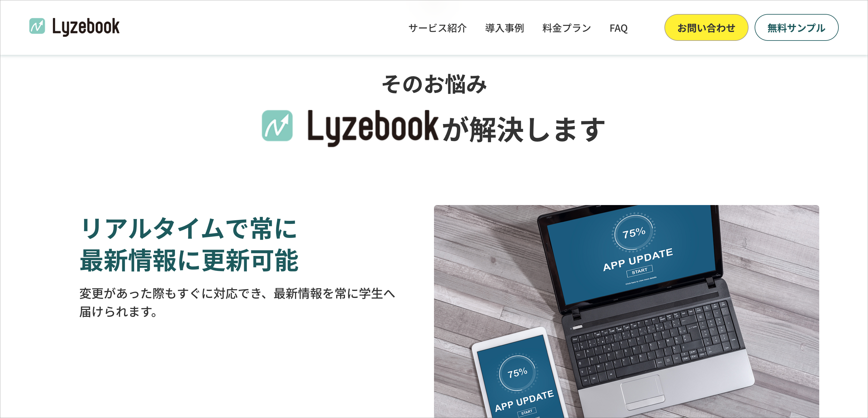 掲示物や配布資料の更新が大変、読まれているのかわからない、教育現場でよく聞かれるお悩みを解決する「Lyzebook」。パソコンやスマホでチェックできることはもちろん、リアルタイムで最新情報を更新できる、アクセス分析できるなど多機能な特徴を紹介し、体感いただける特設ページとなっております。