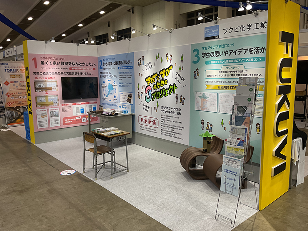 フクビ化学工業様で行っている3つの取り組みを「”学校”と”学び”のための3プロジェクト」としてご提案。また、フクビ化学工業様が積極的に進めている、自治体や大学、他企業とのコラボ・共創による新しい価値づくり「共創新価」とも絡めながら、「共創から生まれる、新たな教育空間のかたち」をコンセプトとして展示会ブースを制作しました。
